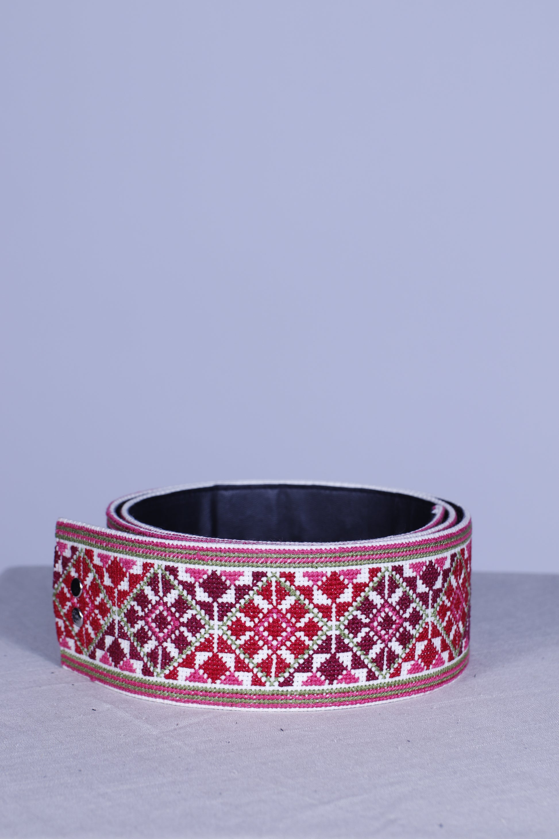 Each belt is embroidered directly onto durable off-white cotton fabric, then stitched onto sturdy leather base for structure and longevity. Fastened securely with metal hook closures, each piece features between 10,000 and 15,000 Fallahi stitches - highlighting the beauty and uniqueness of handmade craftsmanship.